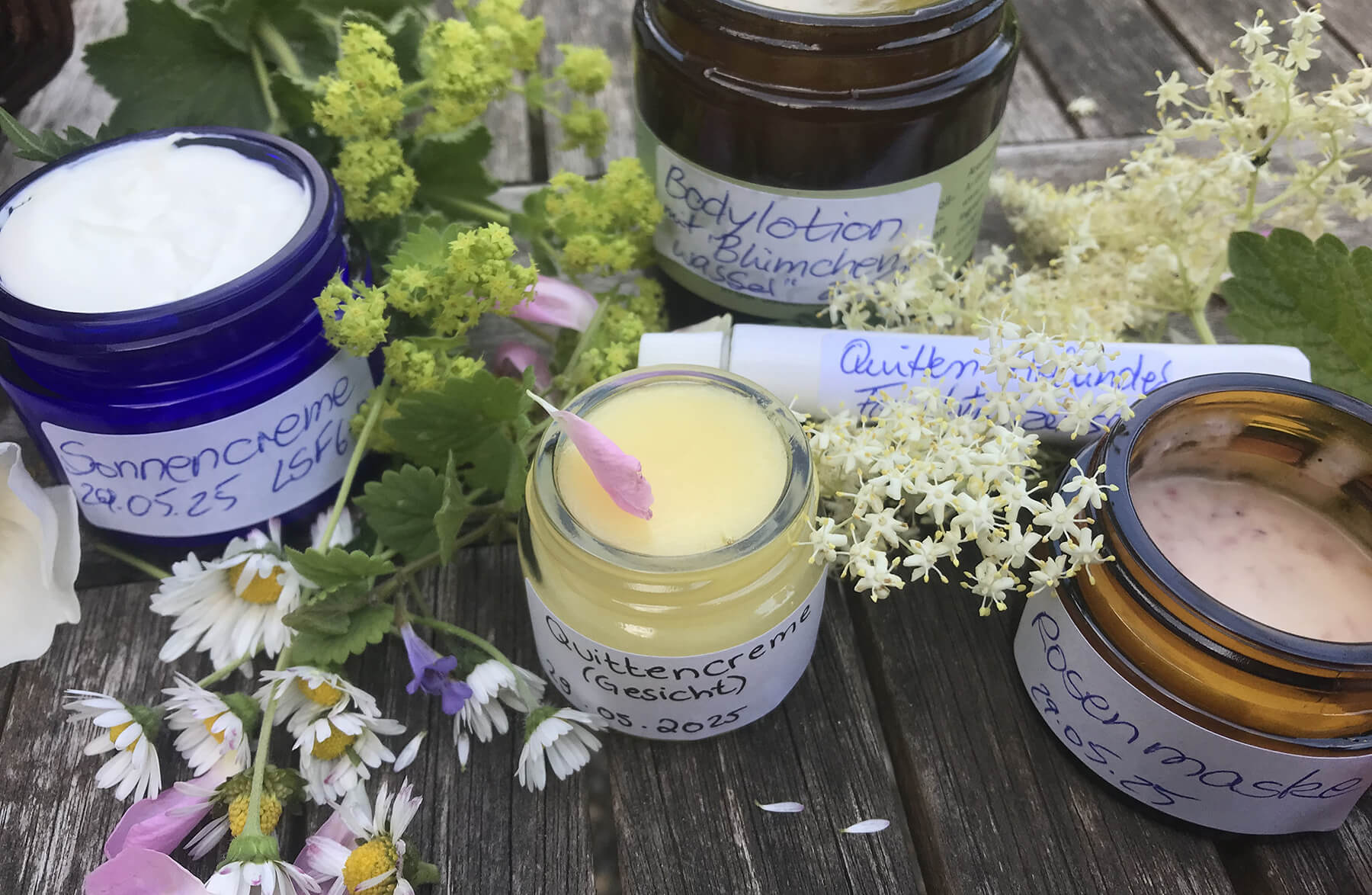Mit Bodylotion, Sonnencreme, einer leichten Gesichtscreme und verschiedenen Blütenwässern wird die Haut im Sommer gut mit Feuchtigkeit versorgt und vor Sonneneinstrahlung geschützt. Eine Rosenmaske, direkt angewendet, sorgt für wohlige Entspannung. Kosten: 35,00 € zzgl. Umlage für Materialien: ca. 20,00 €. Vor Ort zu bezahlen.
